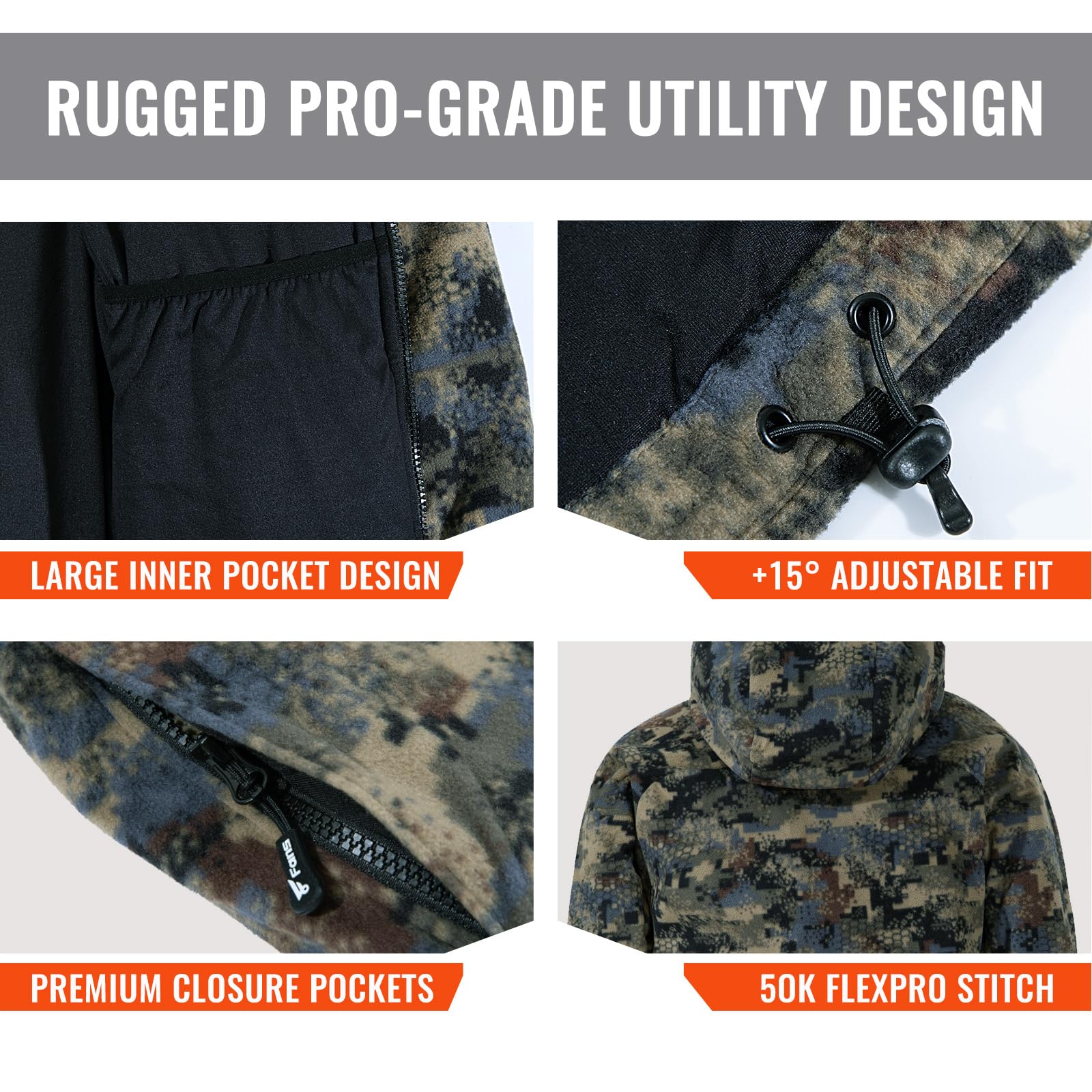- Durable 100% Polyester Fleece: Made from high-quality polyester, this camo hunting jacket is rugged and built to withstand outdoor adventures.