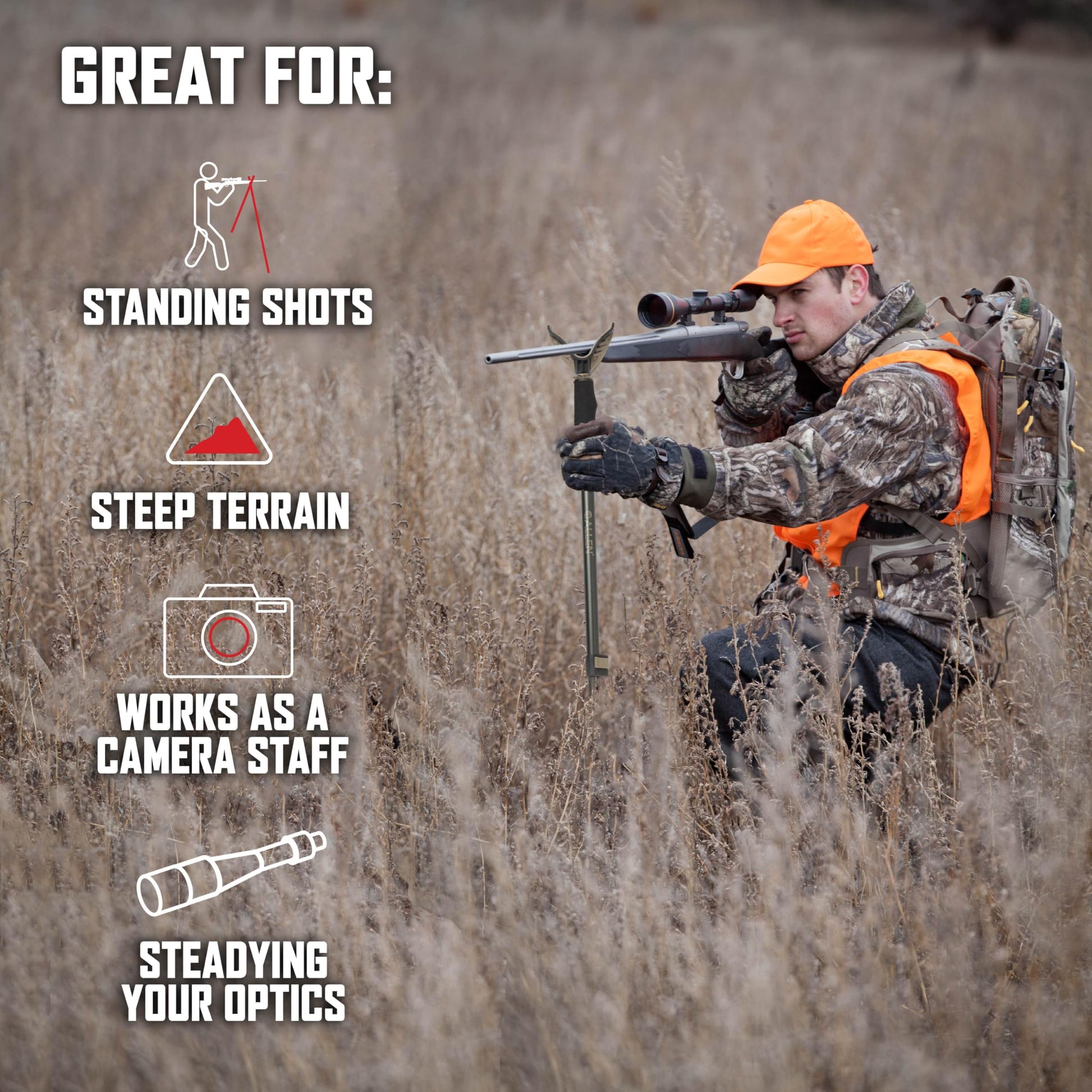 - SHOOTING REST: For both amateur and professional hunters, our monopod stick with a lightweight v-shape yoke keeps your aim steady while trekking through rough terrain or waiting in a blind.