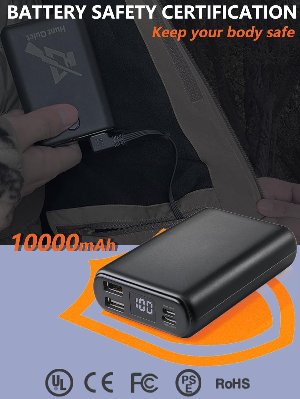 - 【Safe Temperature Control】HuntQuiet heated jacket features 3 adjustable heat settings with just a simple press of the button, blue means low, white shows medium and the red indicates high. Up to 10 working hours on the low, 5.5 hours on medium, 3 hours on high. Our Jacket is equipped with one 10000mAh 5V power bank with UL, FCC, RoHS, CE certification. With safe heating system, this jacket keeps you warm and safe at the same time.