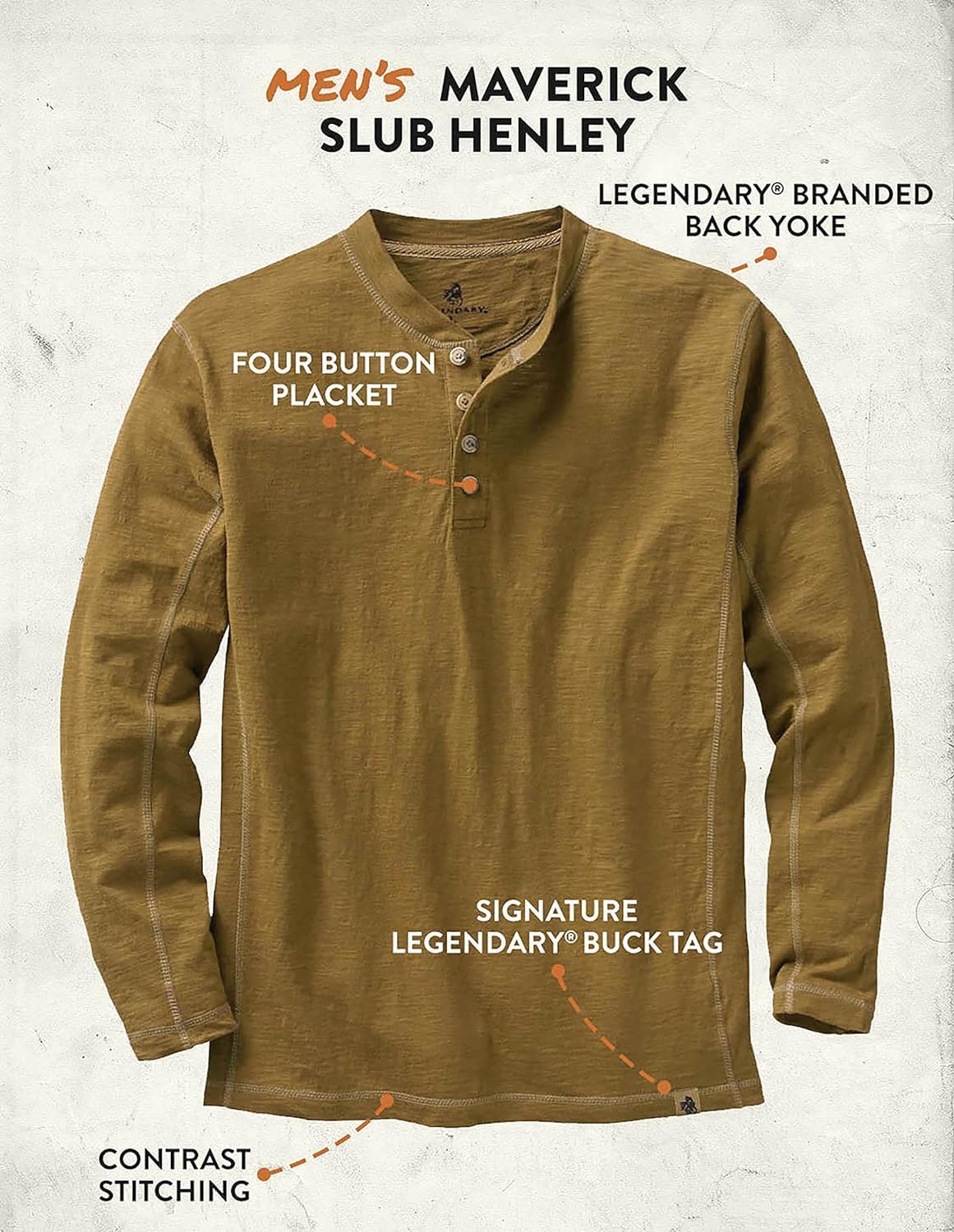 Your new go-to: our Legendary Whitetails Men's Maverick Long Sleeve Henley, made from soft-textured slub fabric. Combining the comfort of your favorite tee with a classic four-button placket and rugged, eye-catching contrast stitching, this shirt doesn’t just layer – it elevates your style. Big & Tall sizes are designed for men over 6'2" and add 2" in body length and 1-1⁄2" in sleeve length.