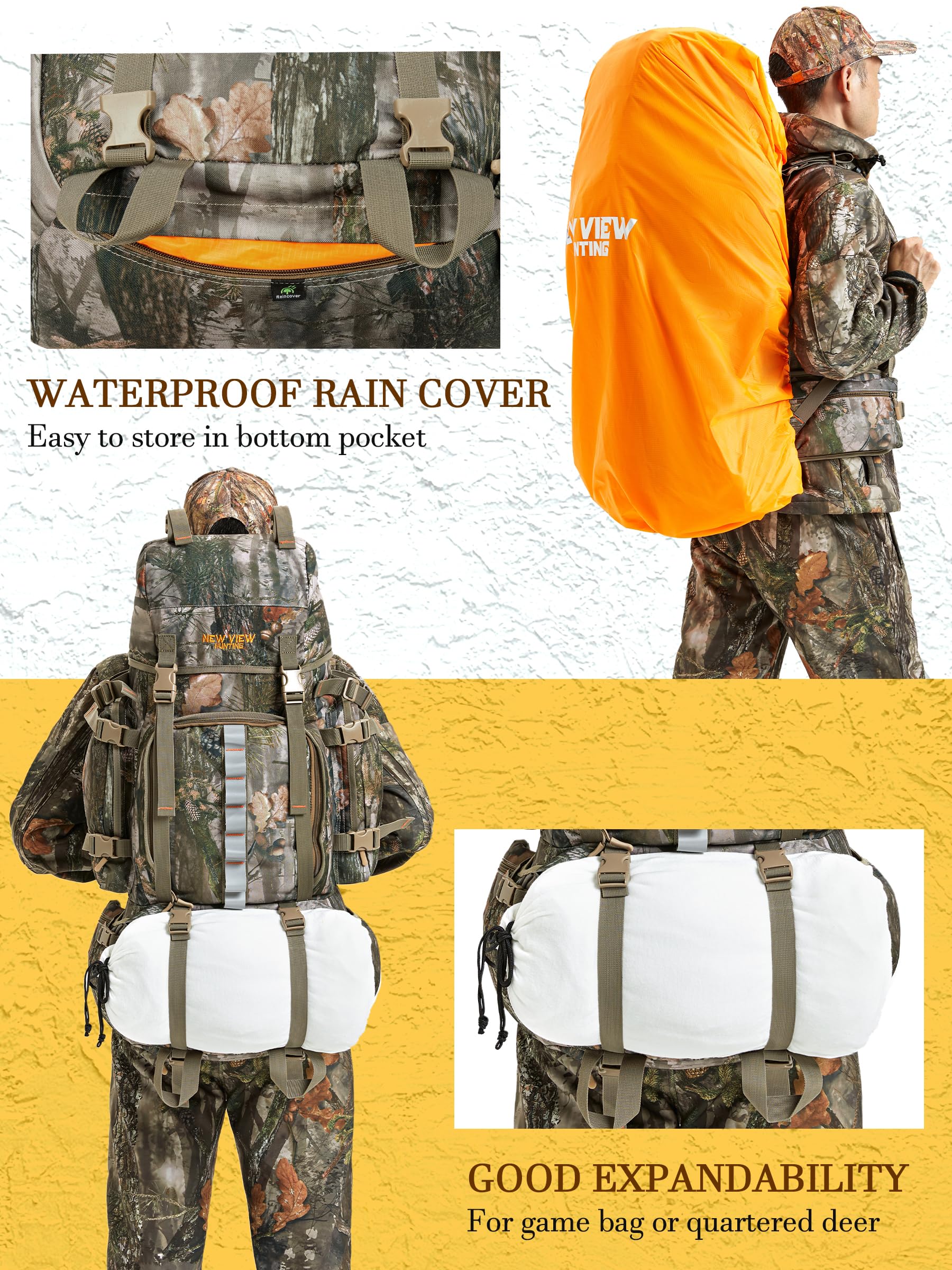 NEW VIEW Hunting Backpack for Men 80L, Camo Bag for Deer, Elk, Waterproof Daypack with Rain Cover & Frame
