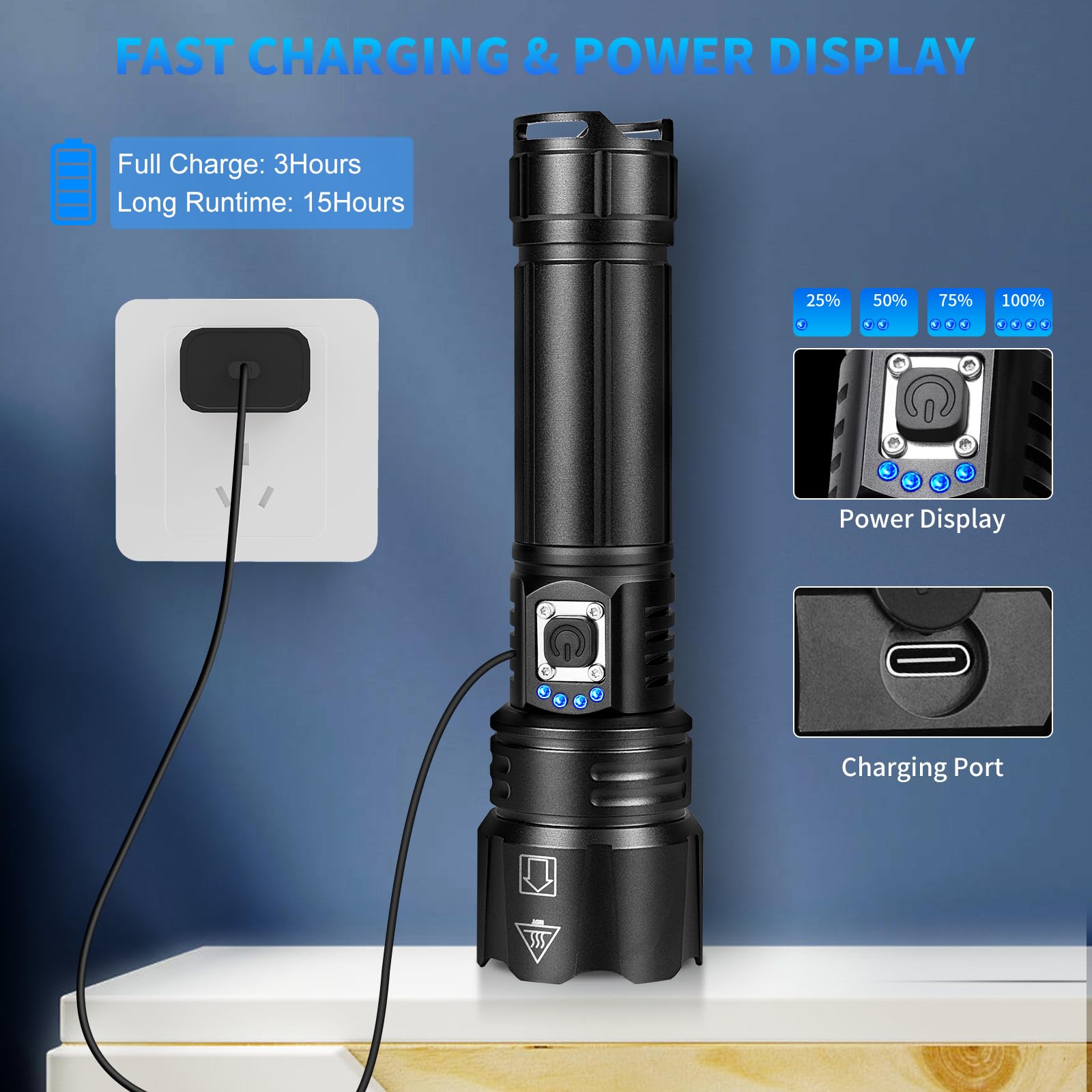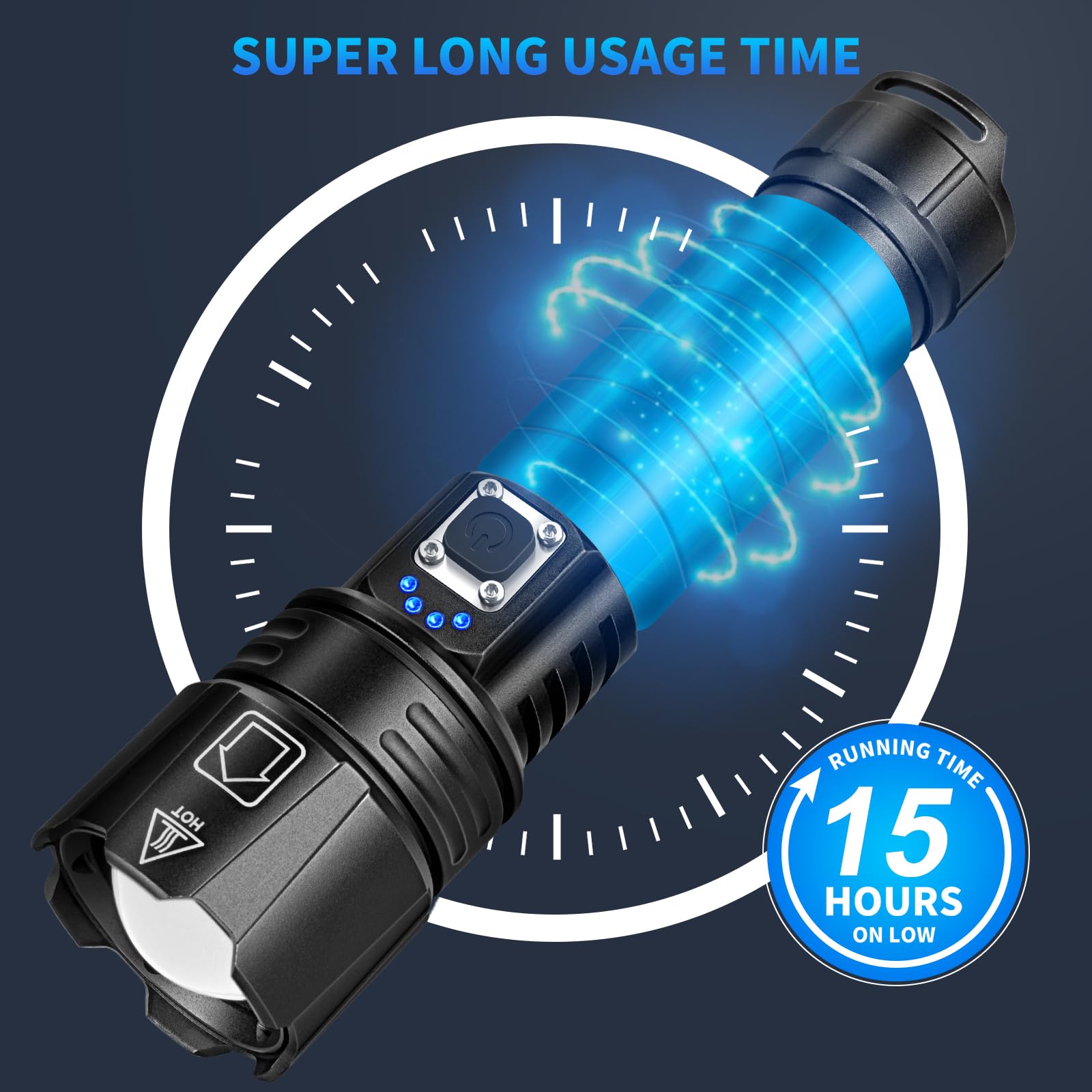 - 【15H Long-Lasting Use】- This high lumen flashlight has a built-in fast charging chip, charging 3 times faster, fully charged in 3 hours. Low mode can be used for 12 hours. Also comes with 4 indicator lights so you can know when to charge
