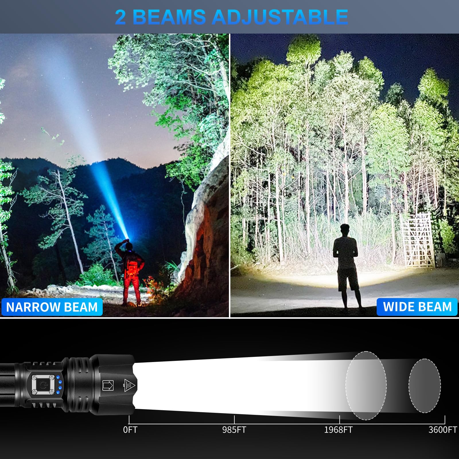 - 【Flashlights High Lumens 2-Pack】- The rechargeable flashlight uses an upgraded high-brightness LED chip, with a brightness of up to 99,000 lumens and a lighting distance of up to 3600 feet, bringing you dazzling brightness