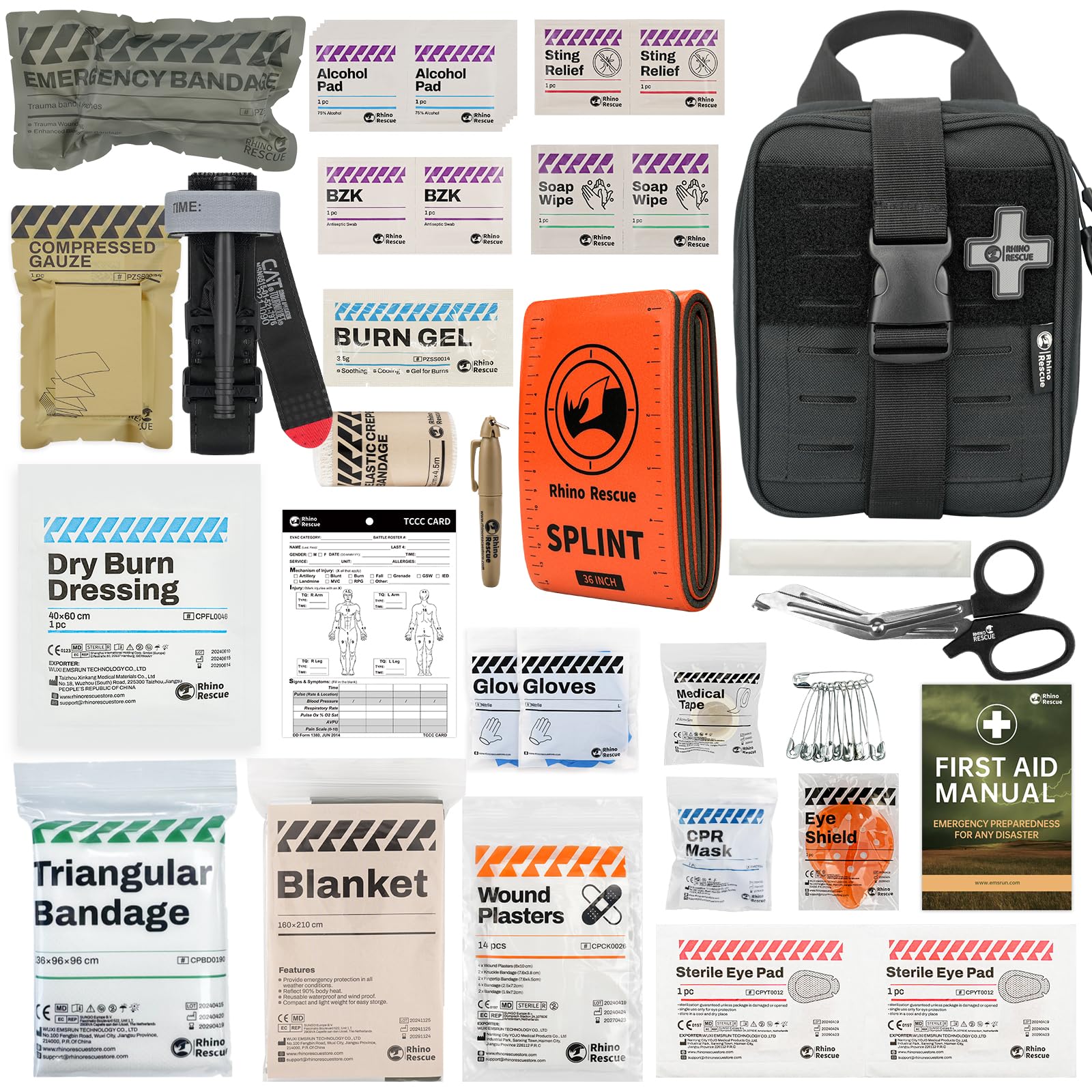 - [Emergency Medical Treatment] The RHINO RESCUE IFAK kit contains essential medical supplies to manage injuries in emergencies. It includes 4" Israeli bandage, gauzes, tourniquet, and emergency blanket