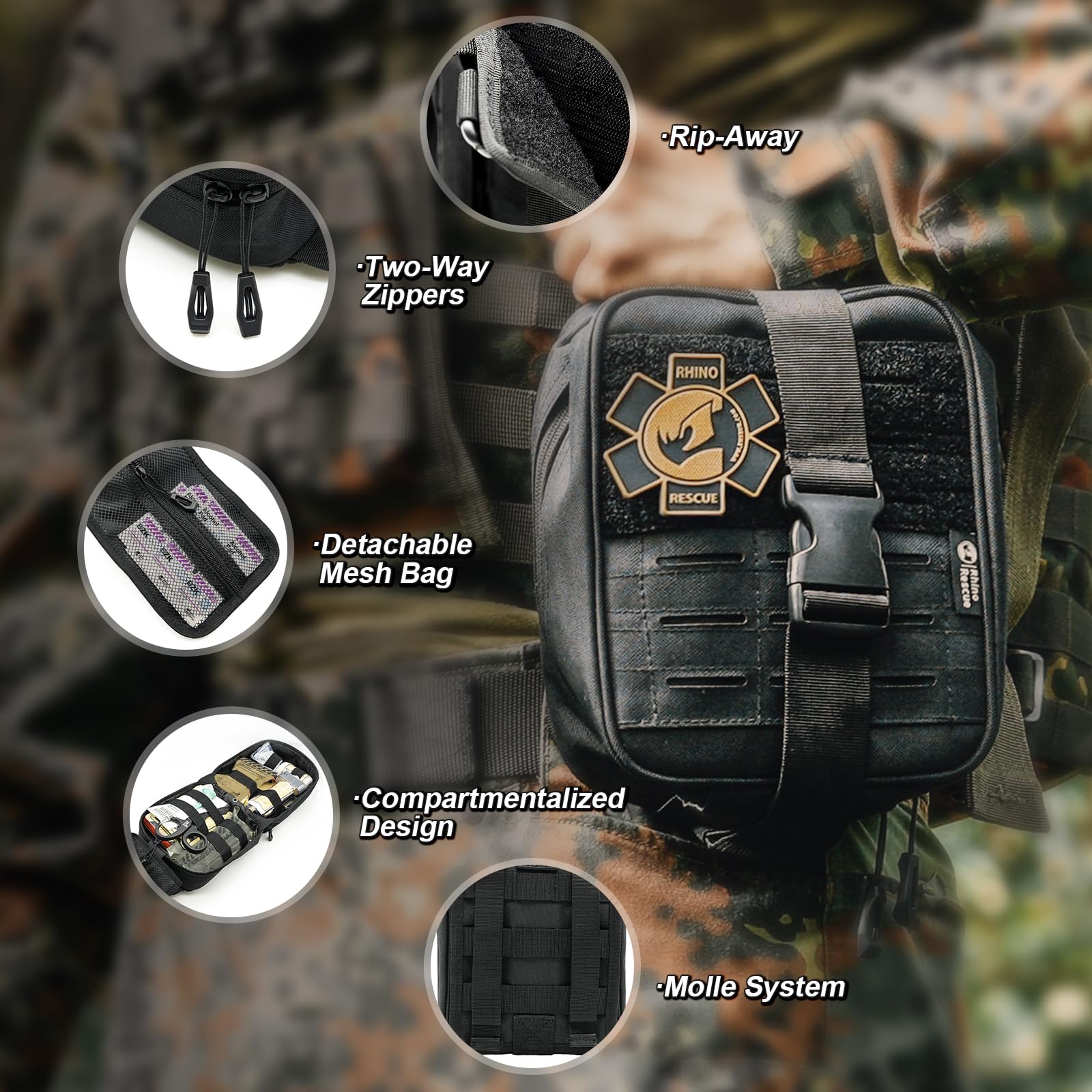 RHINO RESCUE IFAK Trauma Kit with C-A-T Tourniquet for Wound Care, Tactical First Aid Kit Molle Pouch for Military, Combat, Car, Camping, Hiking, Travel (Black)