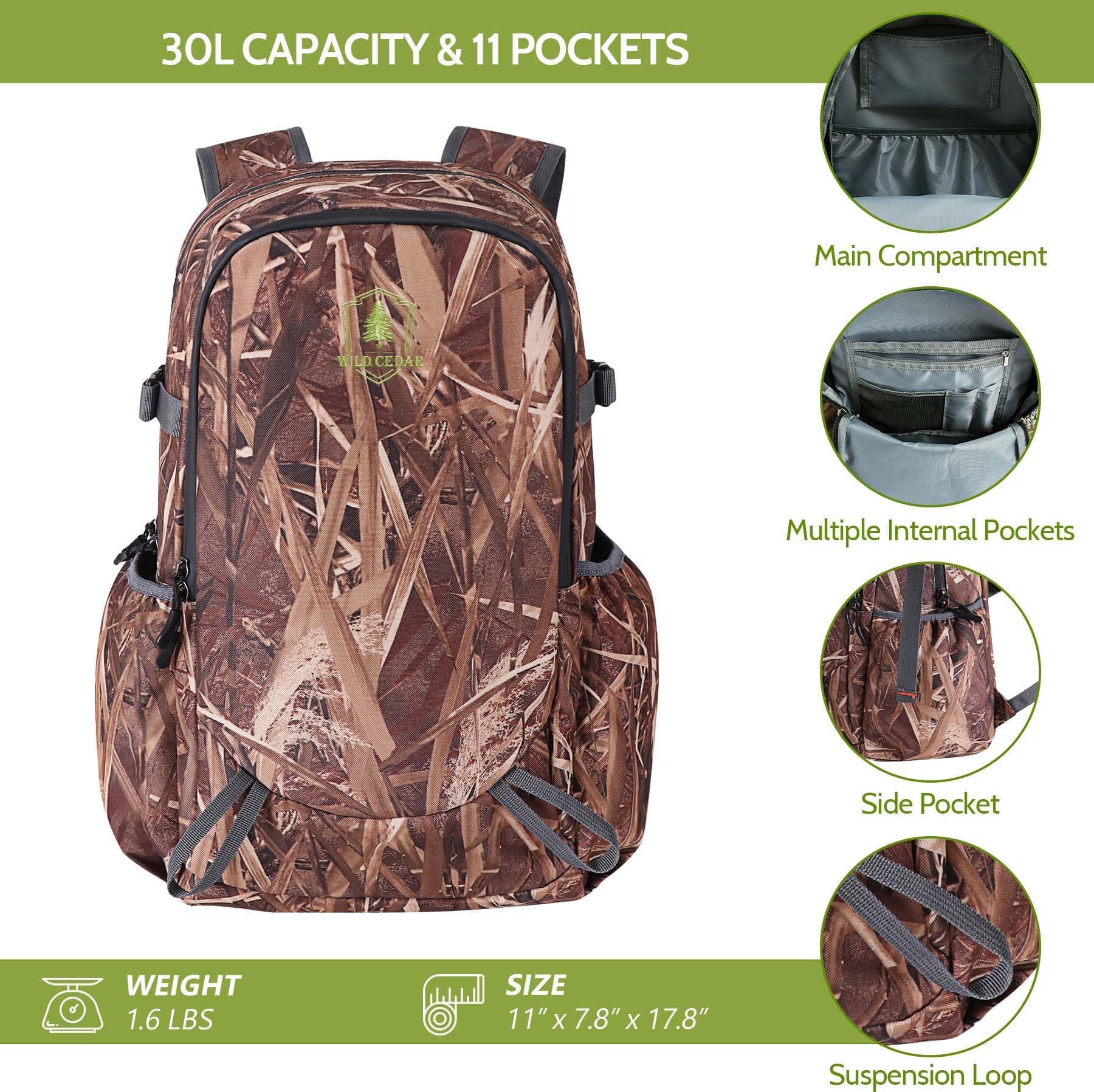 Wild Cedar 30L Kids Camo Hunting Backpack with 11 Pockets, Small Lightweight Hunting Bag for Youth, Men Water Resistant Day Pack for Boys & Girls, Travel, Hiking, Camping